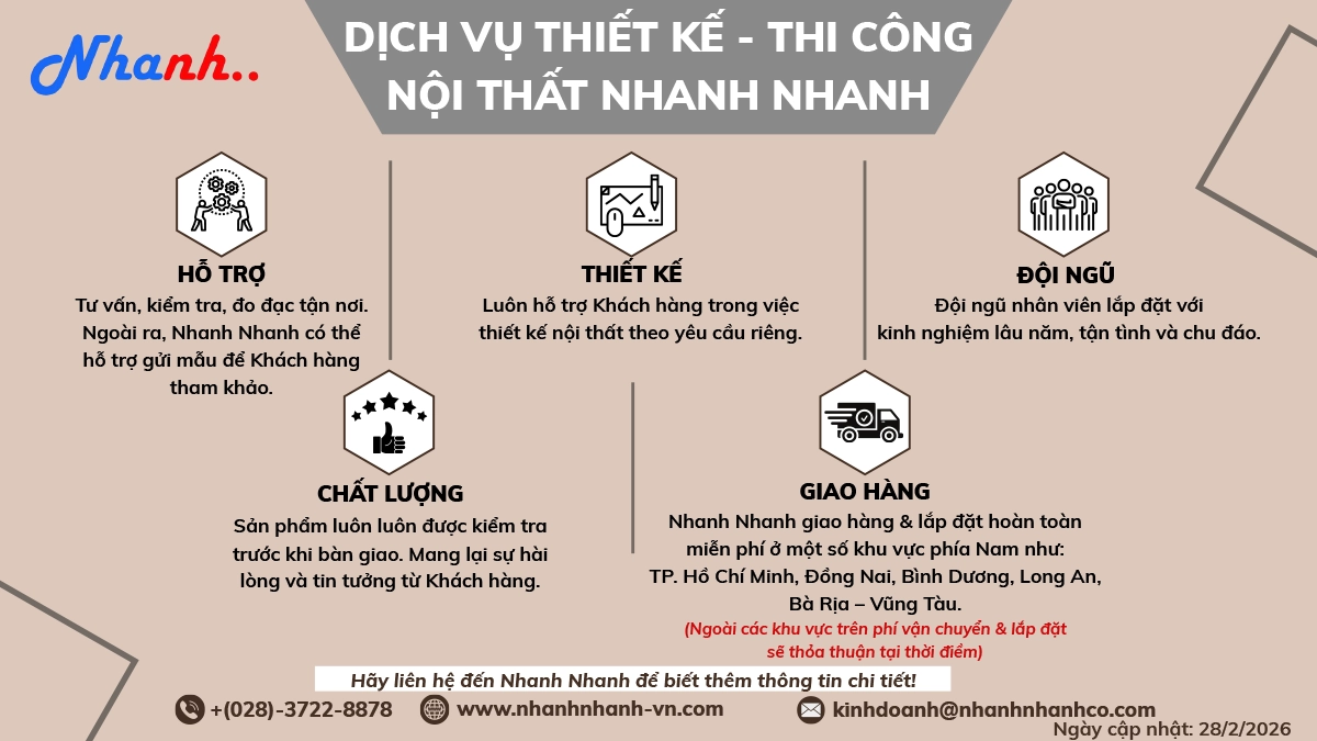 Với nhiều năm kinh nghiệm trong lĩnh vực thiết kế và thi công nội thất, Nhanh Nhanh mang đến cho Quý Doanh nghiệp giải pháp toàn diện: